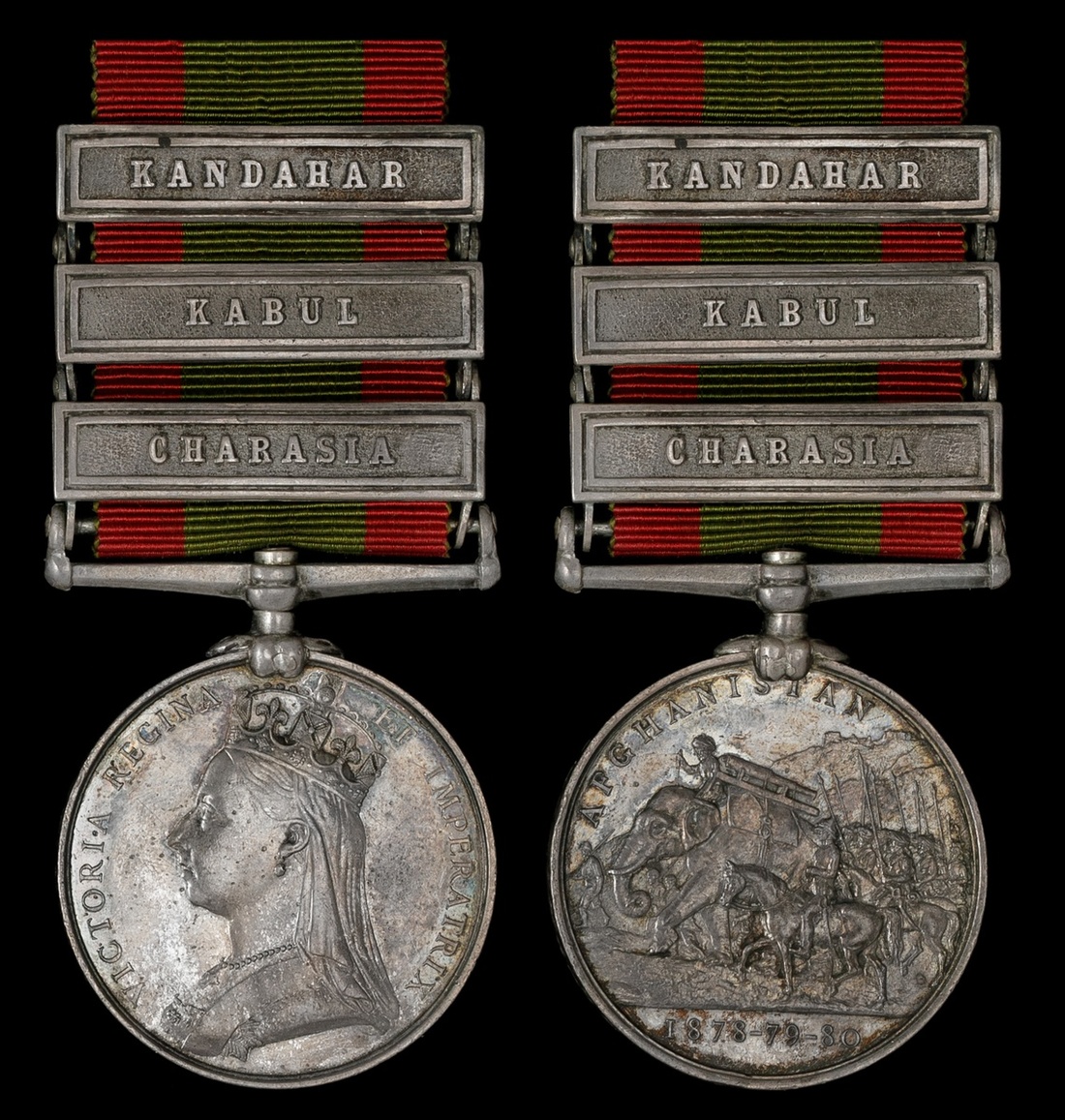Great Britain. Afghanistan Medal, 1878-1880. Three clasps: "Charasia", "Kabul" and "Kandahar" (B/394.PTE A. THOMPSON. 92ND HIGHRS.). Engraved. On ribbon. Some small obverse contact digs. Toned. About Extremely Fine.
