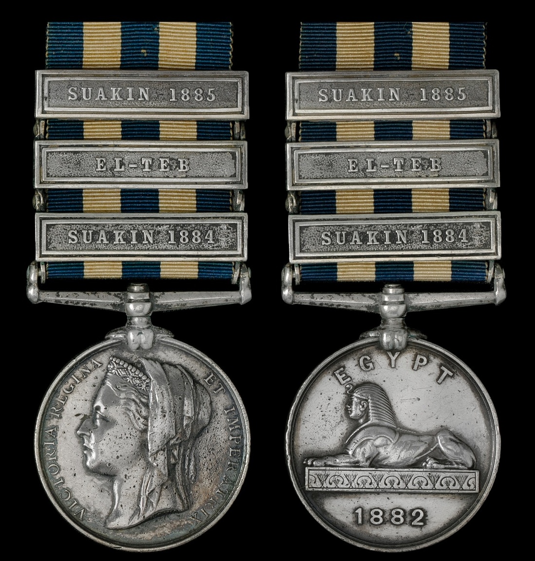 Great Britain. Egypt Medal, 1882-1889. Dated 1882. Three clasps: "Suakin 1884", "El-Teb", and "Suakin 1885" (25376, GUNR W. CURRIE, 6/1ST SCO:DIV: R.A.). Engraved. On ribbon (separated at top). A number of small obverse surface contact digs. About Very Fine.