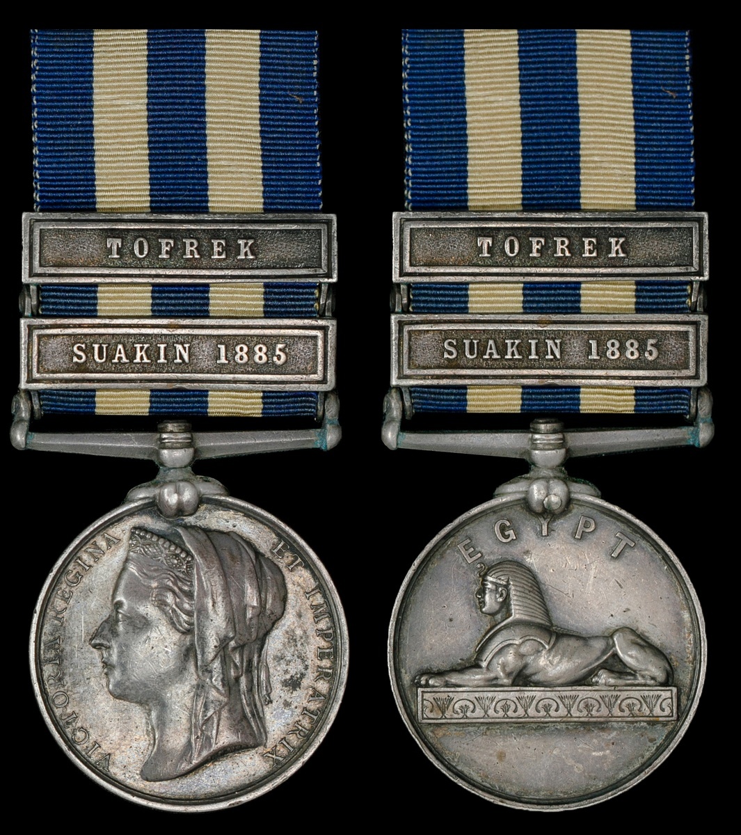 Great Britain. Egypt Medal, 1882-1889. Not dated. Two clasps: "Suakin 1885", and "Tofrek" (43734, GUN: D. O'KEEFFE, 2/1. SO:IR: DIV: R.A.). Engraved. On ribbon. Toned over a few small hairlines. About Extremely Fine.