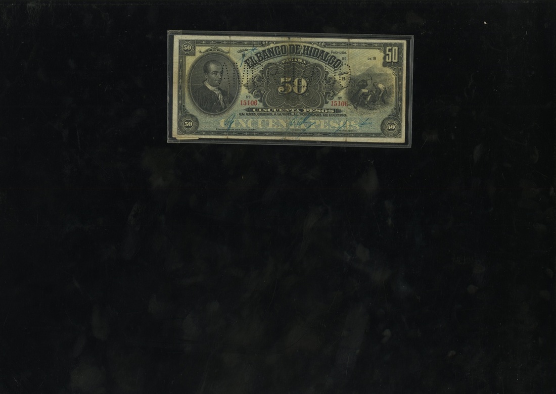Mexico. Hidalgo. Banco de Hidalgo. 50 Pesos. 19xx. P-S308r2. Romero de Terreros portrait at left, mining scene right. Perforated AMORTIZADO. Blue-green ink signatures? and notation. Light stain on back.