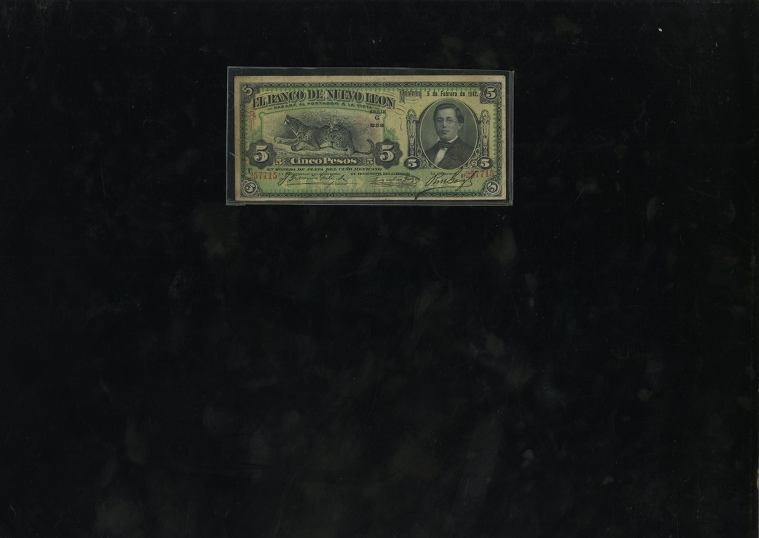 Mexico. Nuevo León. Bacon de Nuevo León. 5 Pesos. 5 Feb 1912. Series G. P-S360c. Jaguar seated at left center, Zaragoza at right; State Seal. Some soiling back left edge, and lightly penciled number top edge. VF.