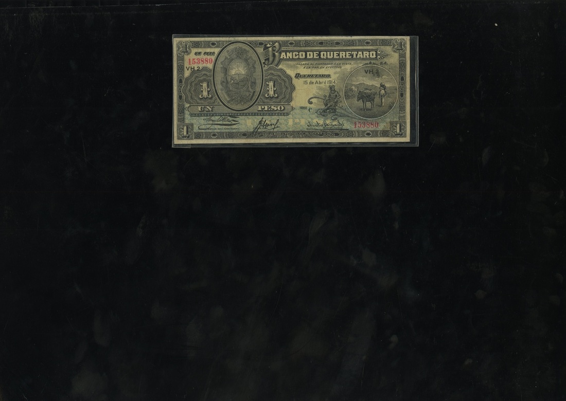 Mexico. Querétaro. Banco de Querétaro. 1 Peso. 1914. Series C. Man with pack mule at right, seated Indian center right, State Arms at left. VF.