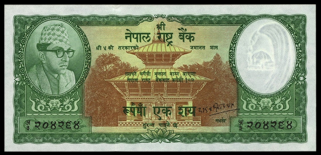 Nepal. Kingdom. Central Bank. 100 Rupees. ND (1961). P-15. King Mahendra Bir Bikram at left, Lalitpur temple at center; Indian rhinoceros. Small handling pinch upper edge, otherwise Unc.