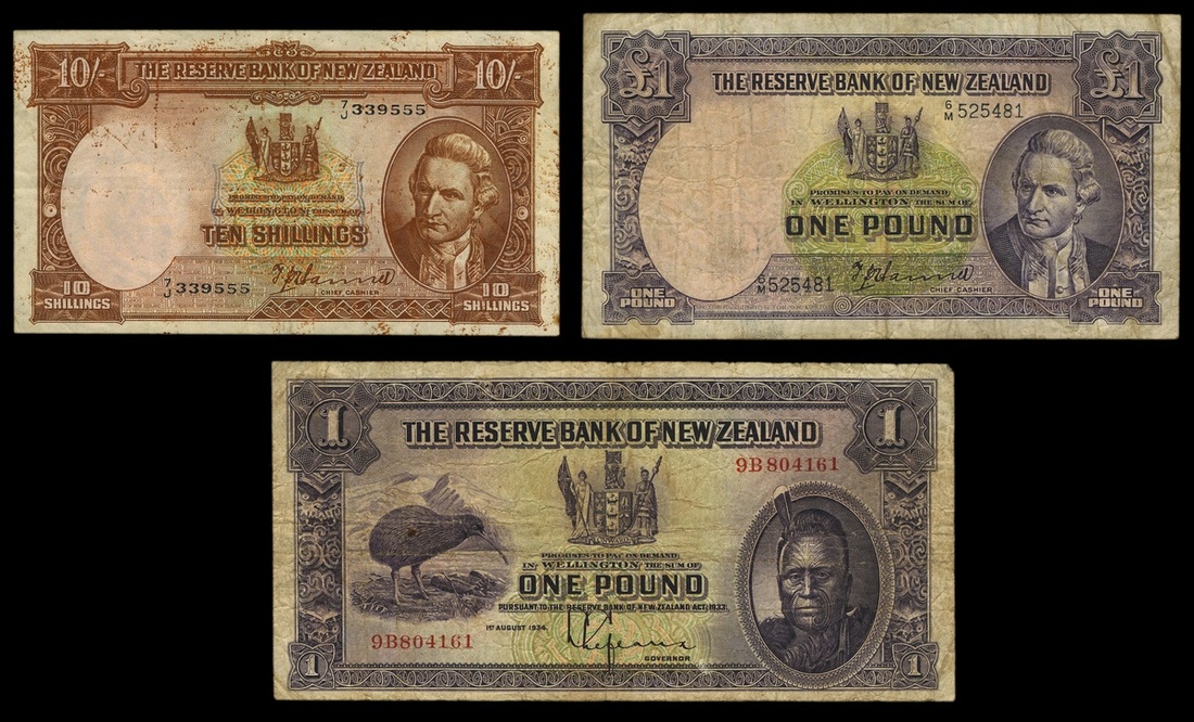 New Zealand. Reserve Bank. Trio. 1 Pound. 1934. P-155. Kiwi left, Maori right. Snorter note with five signatures on back. Fine details; 10 Shillings. P-158a. About VF, ink speckling; and 1 Pound. P-159a. Capt. Cook at right. Fine. [3]