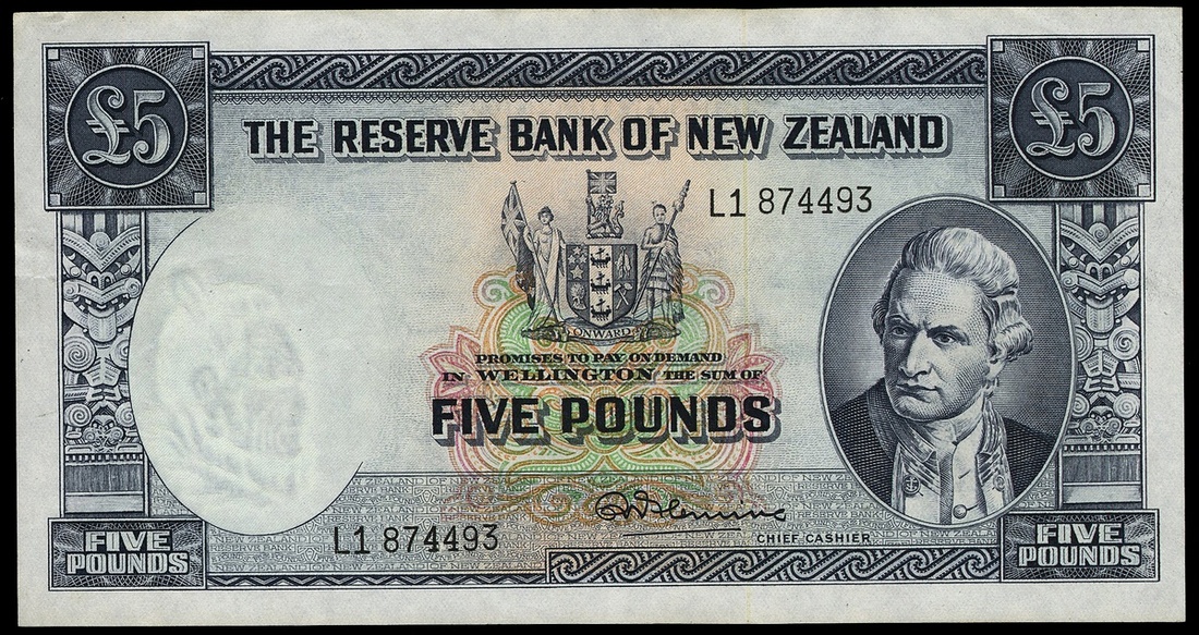 New Zealand. Reserve Bank of New Zealand. 5 Pounds. ND. (1960-67). P-160d. Signature: R.N. Fleming. Capt. Cook portrait at right. EF.