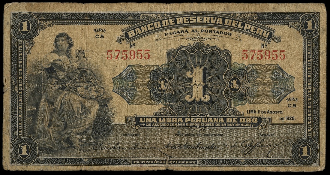 Peru. Banco Central de Reserva del Perú. Provisional issue. 10 Soles. ND (1935). P-57. Overprint on 1 Libra (P-53). VG.