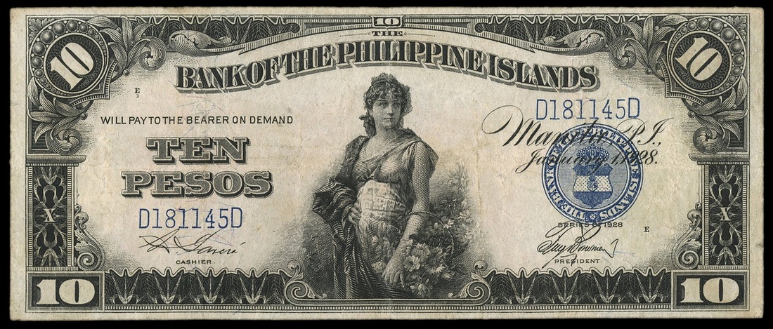 Philippines. U.S. Administration. Bank of the Philippine Islands. 10 Dollars. 1928. P-17. Woman at center. Minor repairs. VF-EF.