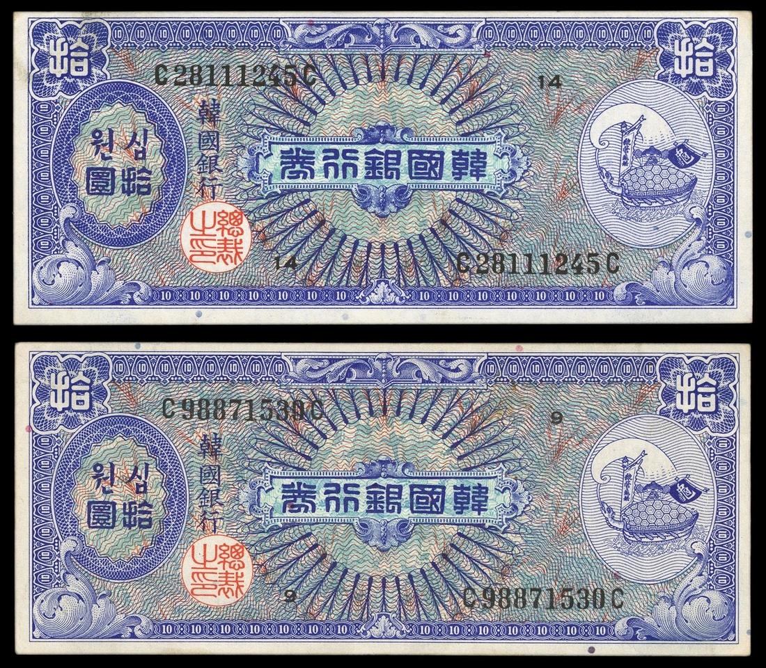 South Korea. Bank of Korea. Pair of 10 Won. ND (1953). Blue. Turtle boat at right. EF and AU. [2]