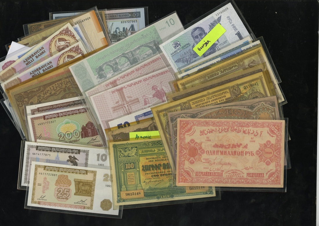 Caucasian Lot. Armenia. 50, 100 and 250 Rubles. 1920. P-30, 31, 32. AU; modern issues, P-33-39, 41, 42. EF-Unc; Azerbaijan. 50 Rubles. 1919. P-2 (2). Both AU, 500 Rubles. 1920. P-7. About EF; SSR. 250,000 Rubles. 1922. P-S718. AU, 1 Million Rubles. 1922. P-719a (2). VG and AU; Modern issues (9). AU-Unc; Nagorno-Karabakh. 20 (2) and 10 Dram. 2004. AU-Unc; and Georgia. 50 Rubles. 1919. P-11. EF-AU; modern issues (3). [34]