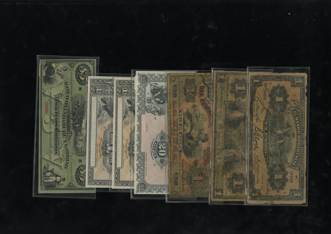 Latin America. Commercial Bank group.Argentina. Banco Oxandaburu y Garbino. 5 Bolivianos, 1869. P-S1783r. AU; Ecuador. Banco del Ecuador. 1 Sucre, 1901. P-S151c. VG, repairs; Banco Sur Americano. 1 Sucre. P-S251 (2); 20 Sucres. P-253. AU-Unc; El Salvador. Banco Agricola Comercial. 1 Peso, 1913. P-S101b. VG; and Banco Occidental. 1 Peso, 1914. P-S174. Old tape repair, G-VG. [7]