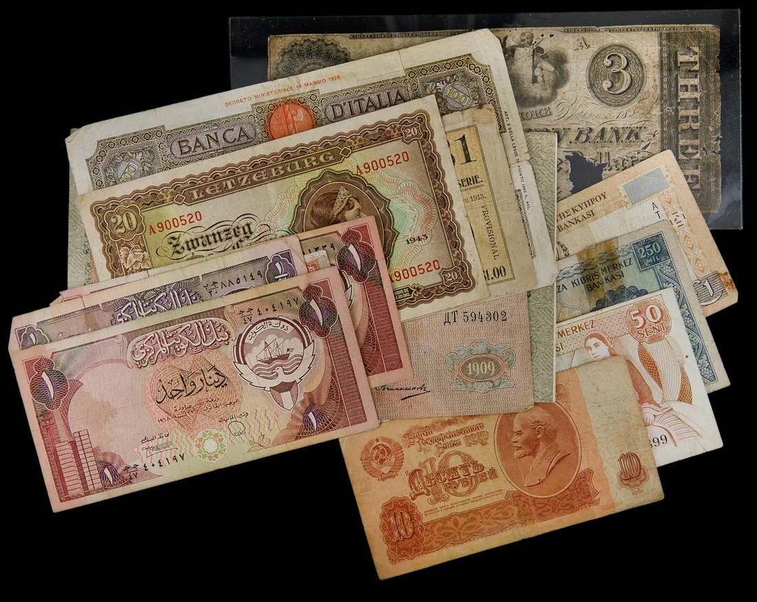 Small Lot of World Paper Money. Early 1900s-2001. Issues from Russia, Cyprus, Kuwait, Luxembourg, Sonora - Mexico, Ottoman Turkey, others; and a damaged Maryland obsolete. A few taped. Good-EF. [21]