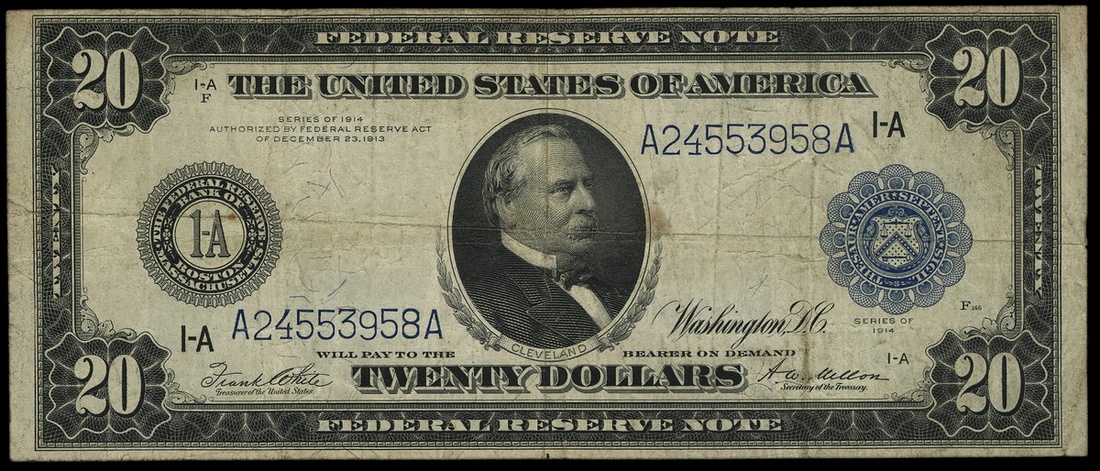 Fr. 967. $20. Federal Reserve Note. 1914. Boston. A24553958A. Blue Seal. White-Mellon. Fine.