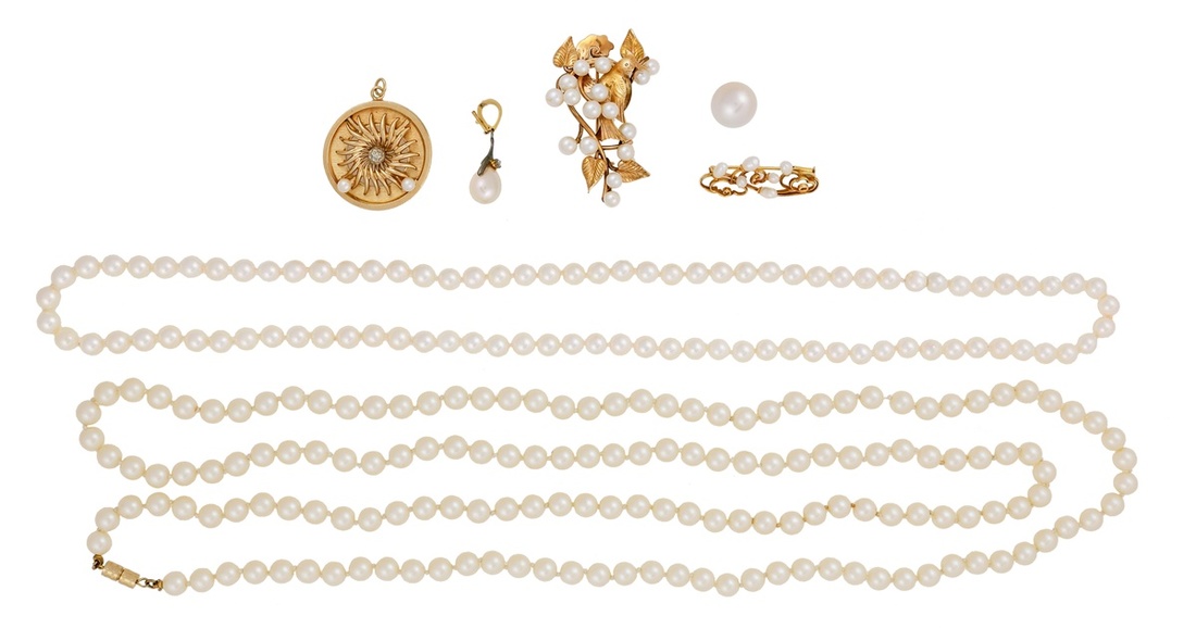 To include: two single line pearl necklaces, one pearl mounted gold sunburst pendant stamped '14K', two pearl floral brooches, one diamond mounted pearl pendant and one large loose pearl. Total weight 109g.