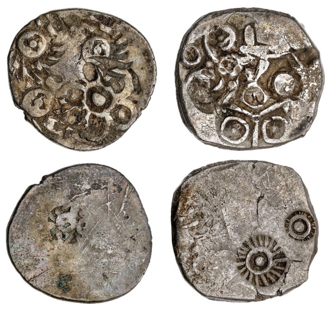 Ancient India. Erikaccha (Erich) in the Raath-Hamirpur region. Punchmarked coinage. Pair, ca. 500-400 BC. AR Karshapana. 3.3 gms. Floral symbol and geometric pattern repeated three times; and AR ½ Karshapana. 1.66 gms. Floral symbol repeated three times. Cf.Mitch.ATEC 3743. Rare. Fine. (2)