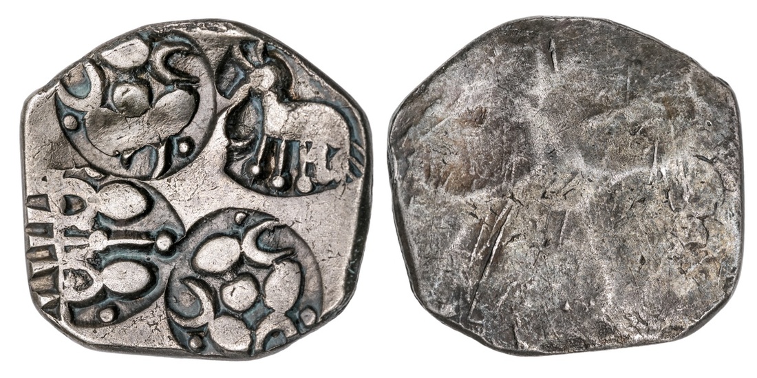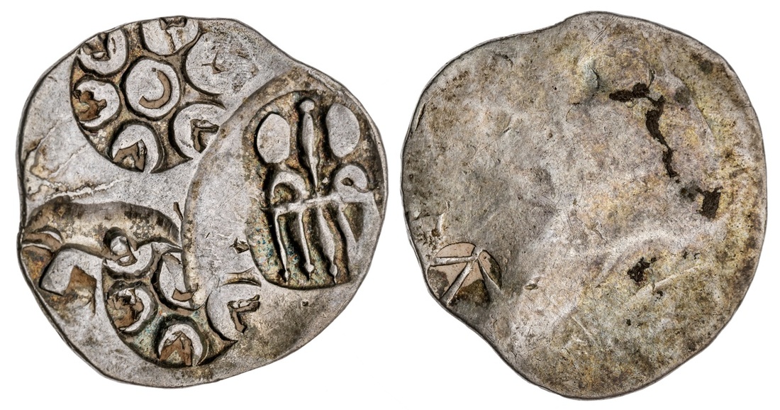 Ancient India. Kalinga. Punchmarked coinage. AR Karshapana, ca. 500-400 BC. 2.92 gms. Candelbra, 6-armed symbol with crescents and pellets (twice) and elephant. Extremely Fine.