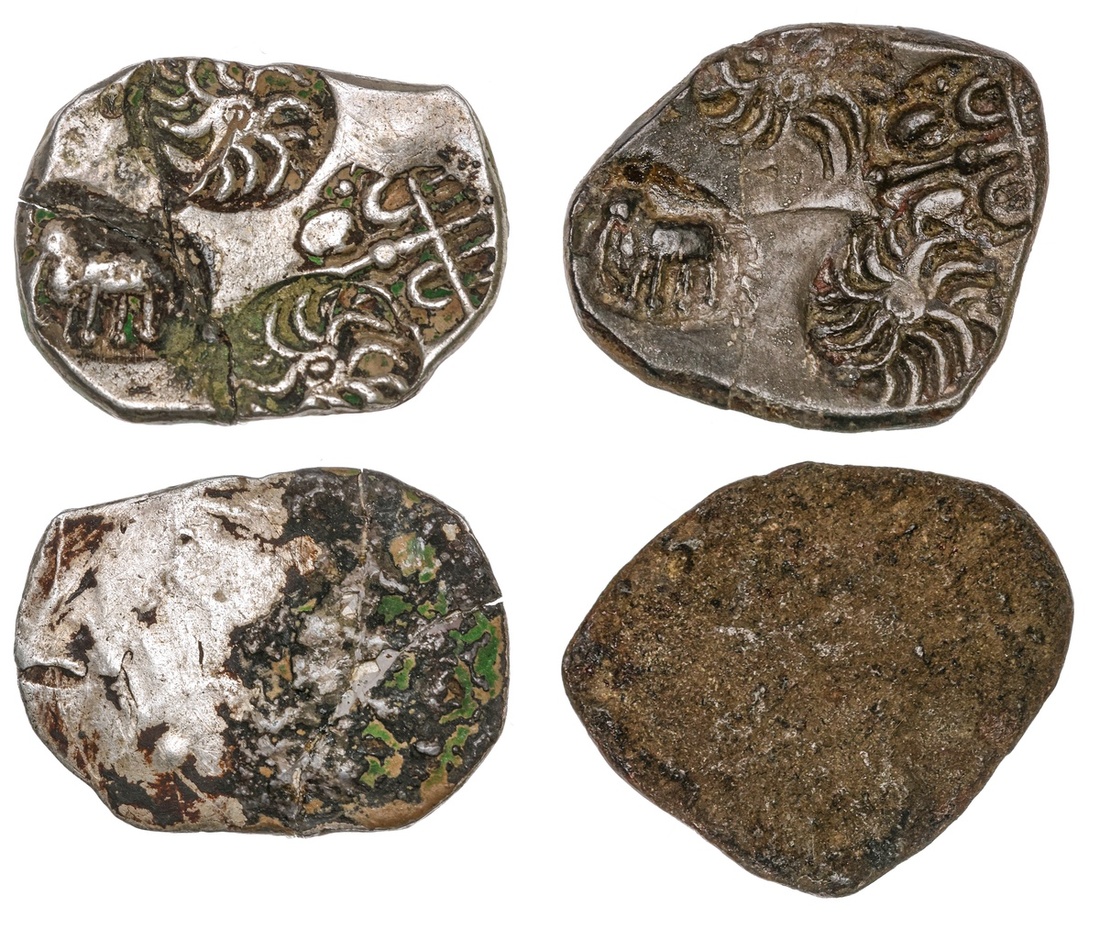 Ancient India. Kalinga. Punchmarked coinage. Pair of AR Karshapana, ca. 500-400 BC. 3.46 and 3.42 gms. Candelbra, sun swirl (twice) and elephant. One with flan crack, light deposits. Toned. Very Fine. (2)