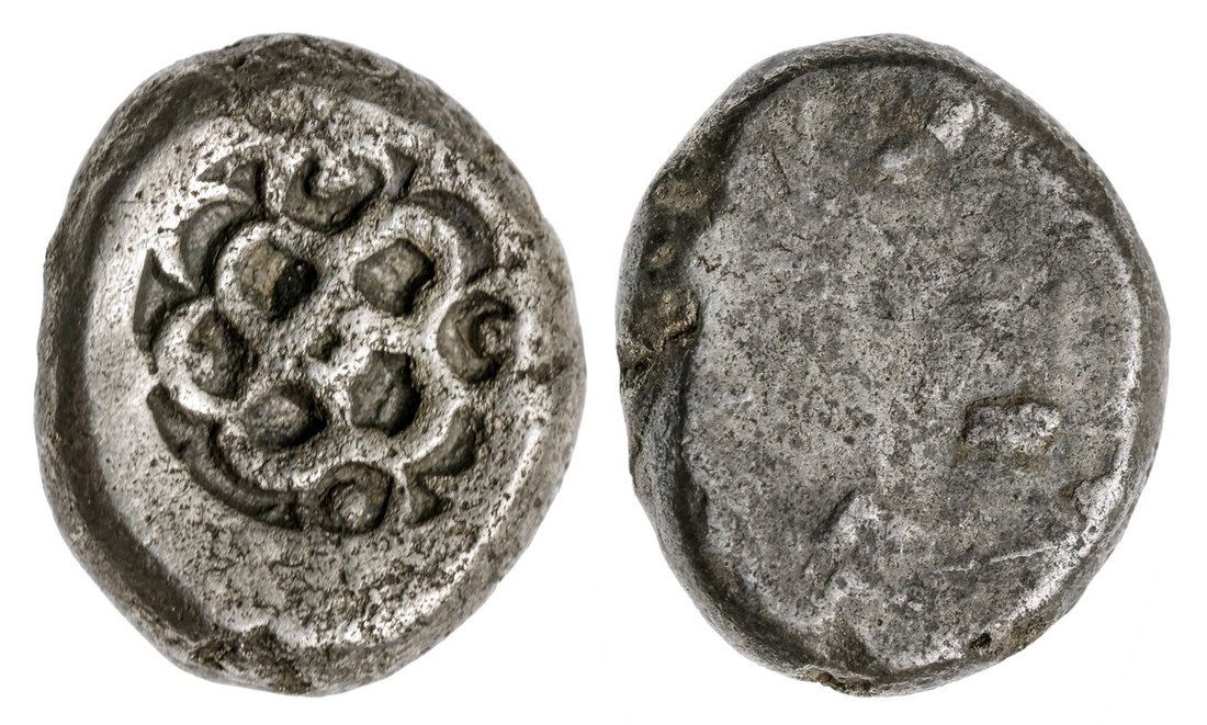 Ancient India. Kausambi. Punchmarked coinage. AR Karshapana, ca. 500-300 BC. 3.04 gms. Complex geometric pattern. Cf.Ra-683ff. Rare. Very Fine.