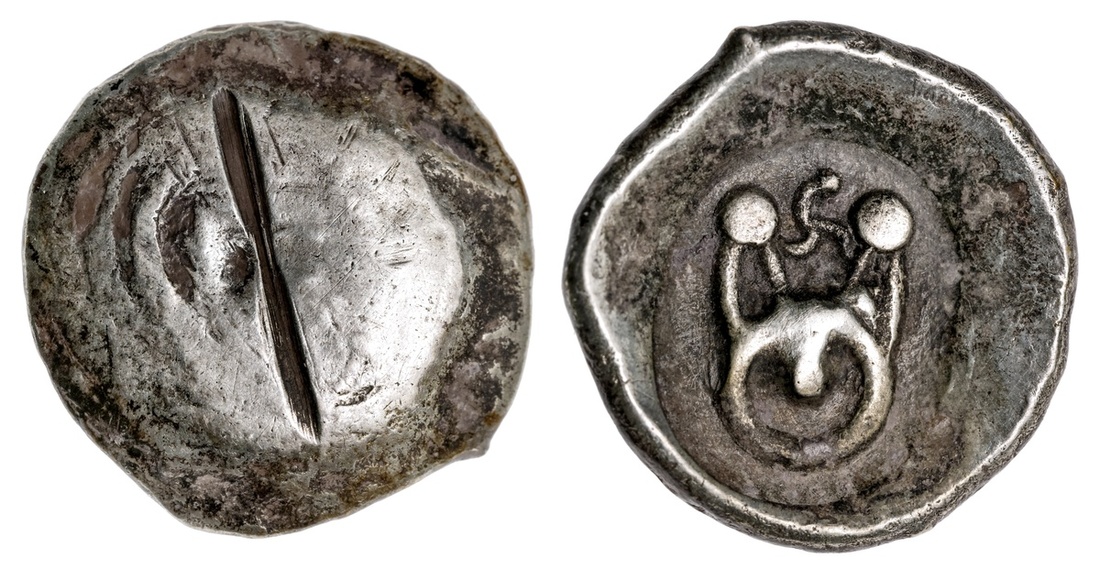 Ancient India. Kuntala. Punchmarked coinage. AR ½ Shatamana, 600-450 BC. 6.67 gms. "Pulley" with simplified swastika above. Ra-502/509. Bankers-test mark on back. Very Fine.