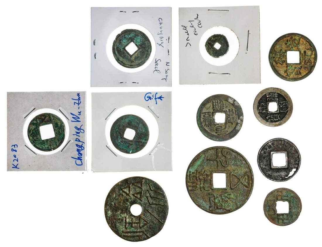 China. Lot of medieval Cash coins. Includes: Northern Qi. Anonymous, 550-577. chang ping wu zhu. H.13.27. Heavy patina, VF; Northern Zhou. Anonymous, 557-581. wu xing da bu. H.13.30. Casting flaw (rent in field), VF; Ten Kingdoms. Southern Tang. Yuan Zu. tang guo tong bao, 959-961. H.15.80. Good VF; Northern Song Cash (3); and a Southern Song Cash; also a small earlier Cash; and three AE Charms. Qing-Republic. 41 and 42mm emulating archaic types; and 25mm wu zhu, left-facing swastika above and below. VF-EF. (11)