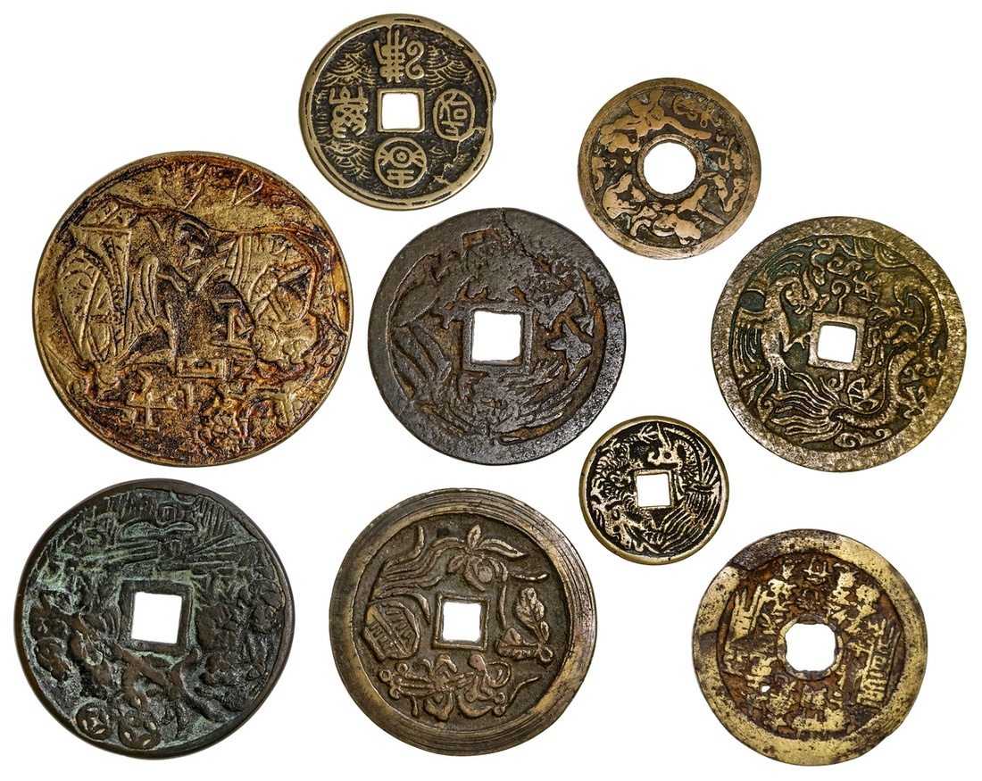 China. Late Ming-Early Republic. Group of Auspicious and Religious Charms. AE and Brass. Dragon and Phoenix types 27, 47, and 47.3mm; Figures and animals (3). 34, 36, and 51mm; Floral/Two Characters, 49mm; Two figures and characters, 59.5mm, solid, no central hole; and legends, 43mm (small casting hole). (9)
