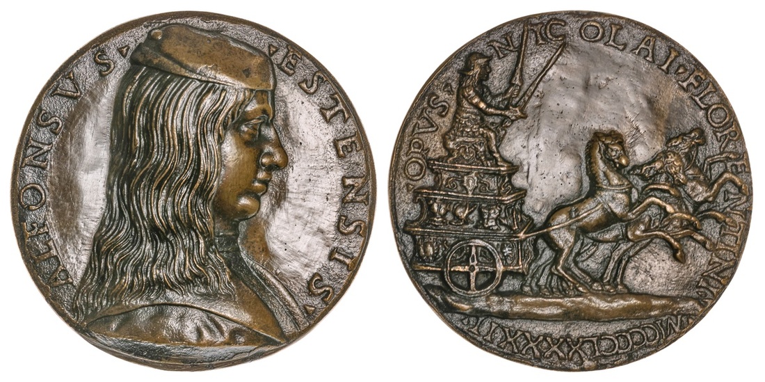 Alfonso I d'Este (1476-1534), third Duke of Ferrara 1505. Medal, 1492. Bronze, 71mm. ALFONSVS.ESTENSIS., Bust right wearing small round cap, rev. The Duke seated right in a triumphant quadriga, signed around: OPVS.NICOLAI.FLORENTINI MCCCCLXXXXII. Pollard 226. One of only a handful signed by the artist. An Extremely Fine old cast. Ex Luc Smolderen, Künker Sale 282, September 28, 2016, lot 4838 (part).