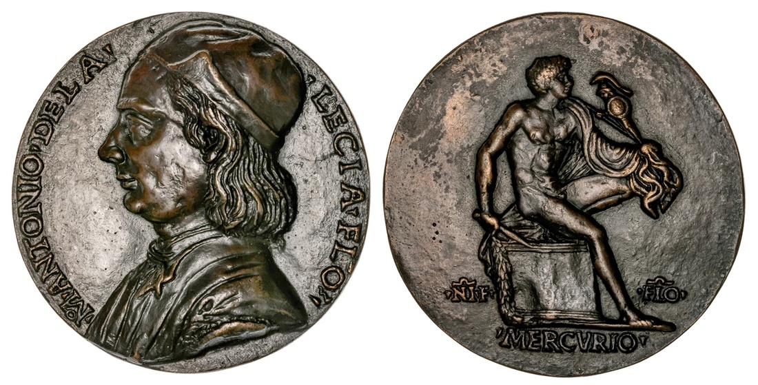 Antonio della Leccia. Medal, Florence ca. 1500. Bronze, 87mm. M.ANTONIO.DELA LECIA.FLO, Capped bust left, rev. Mercury, nude, seated right on a base, a mantled draped on his arm, holding a small figure of the Palladium and a dagger; MERCVRIO below, signed at sides .NI.F. -.FLO. Hill 925. One of the five medal signed by the artist, this piece shares a common medal with the specimen illustrated in Hill's Corpus (90mm+, not contemporary) and probably comes from a pierced example. An Extremely Fine old cast. Ex Numismatica Ranieri Sale, May 22, 2016, lot 2.