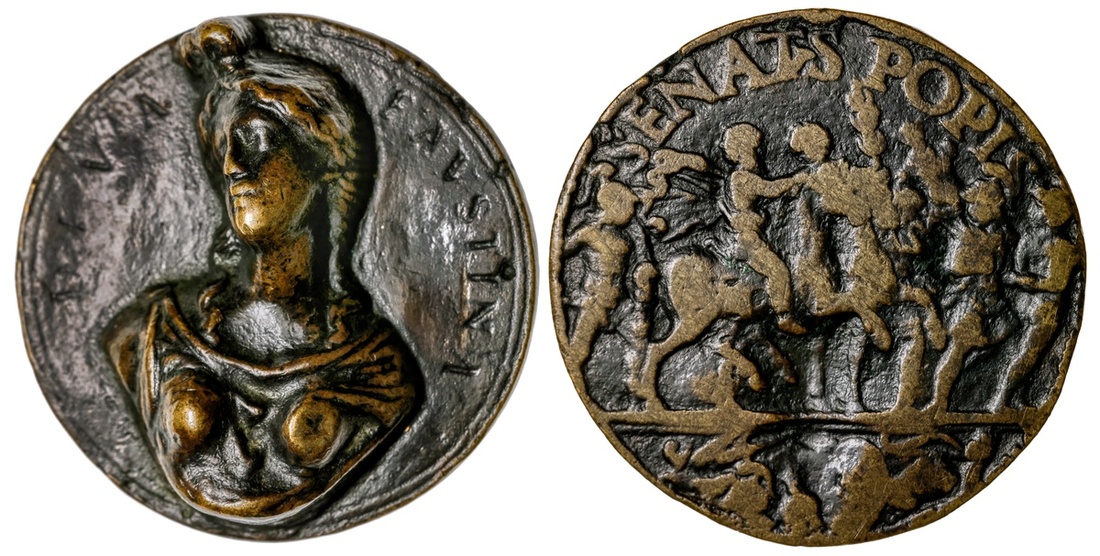 Diva Faustina. Medal. Bronze, 38mm. DIVA FAVSTINA (incuse), Very high relief bust of the Roman empress ¾ left, rev. SENATS POPLS, A senatorial procession, armor and shield in ex. Bange 492; Morgenroth 115; Lewis, The Medallic Oeuvre of Moderno, SHA 21, p.81, fig.7. The reverse typically somewhat weak. A Very Fine old cast.