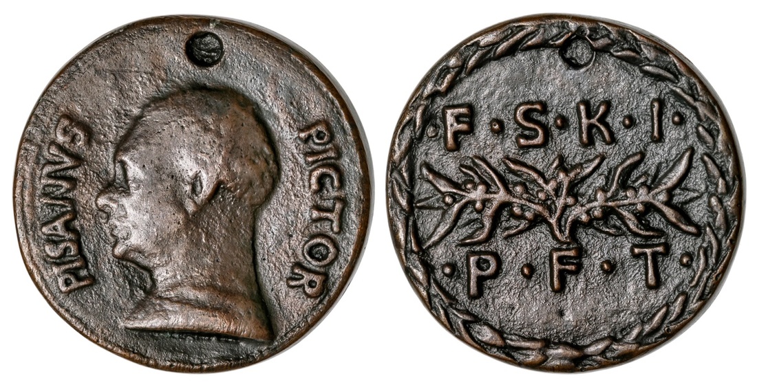 Pisanello (1395-1450). Galvano of a Medal of Ferrara ca. 1445-1450. 33mm. PISANVS PICTOR, Bare-headed bust left of the illustrious artist, rev. F.S.K.I. / P.F.T. separated by branch; the letters standing for the seven virtues - Fides, Spes, Caritas, Iustitia, Prudentia, Fortitudo and Temperantia. Hill 77. Incomplete hole at 12:00. Very Fine.