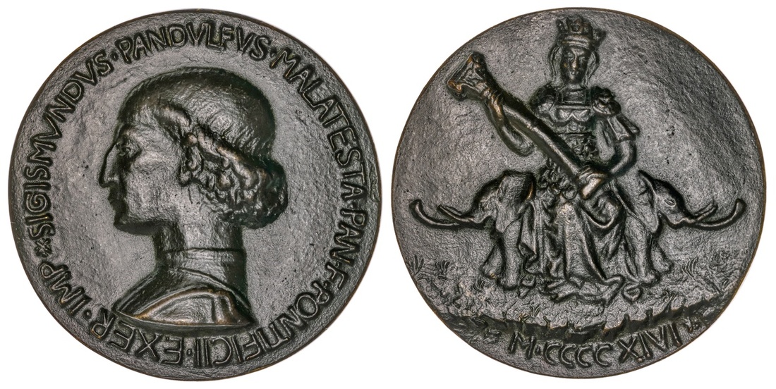 Sigismondo Pandolfo Malatesta (1417-1468), Lord of Rimini, Fano and Senigallia 1432. Medal, dated 1446. Bronze, 82.7mm. *SIGISMONDVS.PANDVLFVS.DE.MALATESTA.PAN.F.PONTIFICII.EXER.IMP, Bare-headed bust of Sigismondo in profile left, wearing surcoat over cuirass, rev. Fortitude seated on a seat the sides of which are formed by two elephants, holding a broken column in both hands, M.CCCCXIVI below (the Roman letter for fifty with no bottom arm). cf. Hill 180; Pollard 26. Dark brown patina. A later cast. Extremely Fine. From the Neil A. Goodman Collection