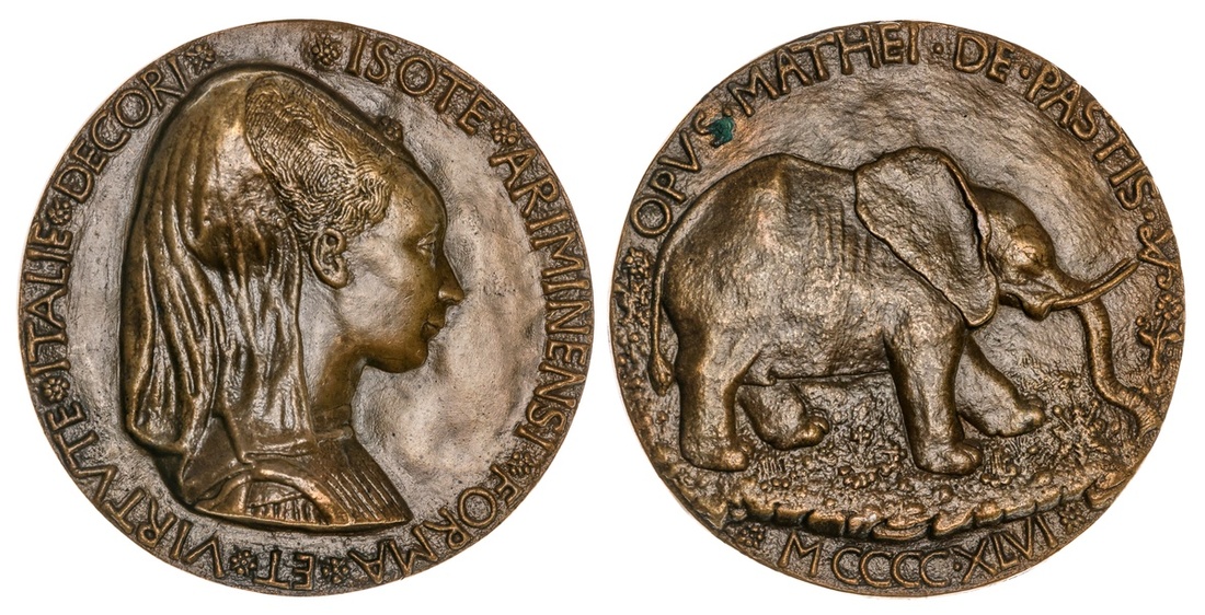Isotta degli Atti (1432/3-1474). Medal, dated 1446. Bronze, 82mm. *ISOTE*ARIMINENSI*FORMA*ET*VIRTVTE*ITALIE*DECORI*, Bust right, her hair over a high frame, veiled in the back, rev. OPVS.MATHEI.DE.PASTIS.Vs, Malatesta elephant right in a flowery meadow, date MCCCC.XLVI below. Hill 167a; Börner 57-58. Isotta degli Atti was the mistress (1446), then wife (1456) of Sigismondo Pandolfo Malatesta. Although dated 1446, the medal was produced some years later as Isotta was not publicly honored until after the death of Sigismondo's second wife in 1449 (the date on the reverse refers to the year she became the Lord of Rimini's mistress). The medal most likely dates to 1453 or shortly thereafter when Isotta was accepted as a member of the Malatesta family. Minor deposit on upper reverse. An Extremely Fine, but somewhat later cast.