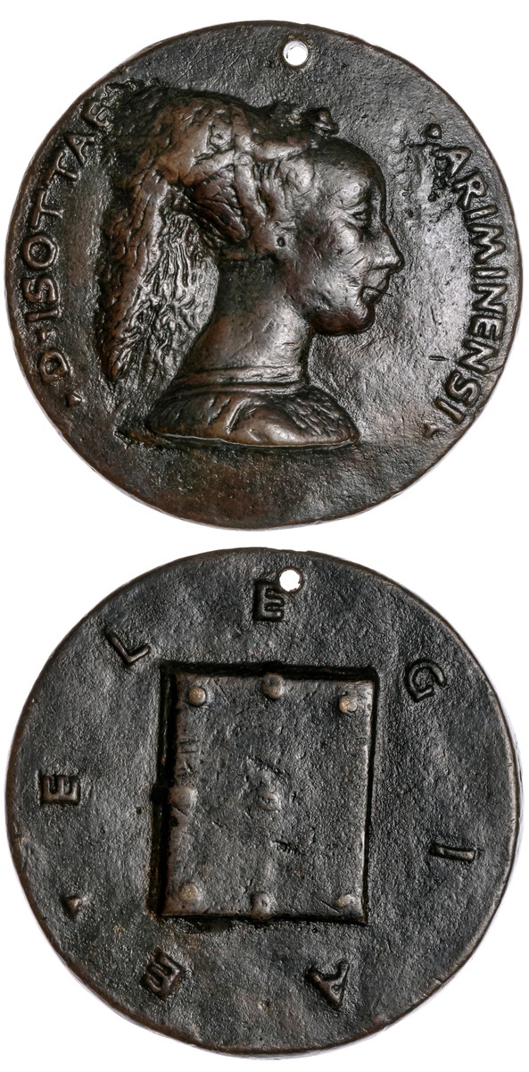 Isotta degli Atti (1432/3-1474), mistress, later wife of Sigismondo Pandolfo Malatesta. Medal, 1446. .D.ISOTTAE.ARIMINENSI., Bust right, her hair in a high frame, wearing veil fastened with a jewel atop forehead, rev. .ELEGIAE arranged around a closed book. The book on the reverse refers to the three volumes of thirty elegies commissioned by Malatesta in 1449-1451. Hill Corpus 188; Pollard NGA 35; Vannel Toderi (Bargello) 87-90; Börner 65. Pierced. A Very Fine old cast. Ex Mellors and Kirk, Fine Art Sale (Nottingham), September 20, 2017, lot 434.