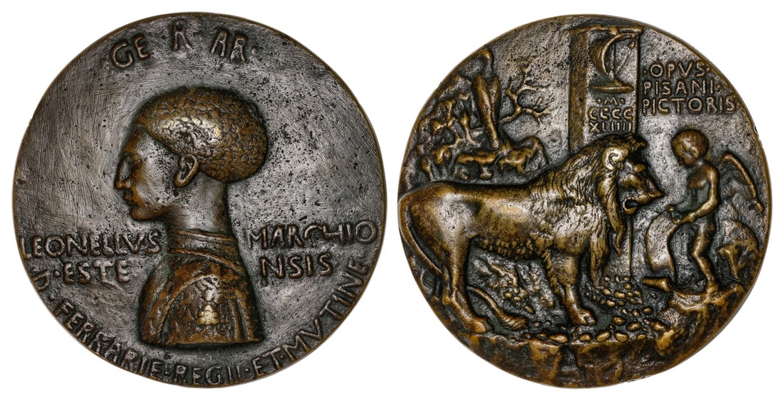 Leonello d'Este (1407-1450), Marquis of Ferrara, Modena and Reggio Emilia 1444. Medal, Ferrara , made in 1444 to commemorate the marriage of Leonello d'Este to Maria of Aragon. Bronze, 97mm. Bust left in embroidered tunic, GE R AR above, LEONELLVS MARCHIO ESTENSIS across, D.FERRARIE.REGIE.ET.MVTINE below, rev. On a rocky crag, a lion standing right regards a scroll of music shown to him by a cupid, square behind - the musical lion a pun on the ruler's name: Leonello ("little lion"), signed .OPVS. / PISANI. / PICTORIS. upper right, Roman date on column. Hill 32. Some old pin scratches in field, yellow-brown patina. A Very Fine later cast.