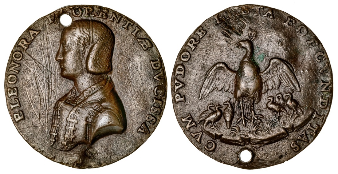 Eleonora di Toledo (1522-1562), Duchess of Florence 1539. Medal, Florence ca. 1552. Bronze, 43mm. ELEONORA FIORENTIAE DVCISSA, Bust left wearing gown, earring and hairnet, rev.CVM PVDORE LAETA FOECVNDITAS ("Joyful fecundity with modesty"), A pea-hen sheltering its six young under its wings. Attwood 801. Eleonora would bear her husband, Cosimo I de'Medici eleven children. Pierced. Obverse scratches, scrape reverse near edge. Otherwise a Very Fine old cast.