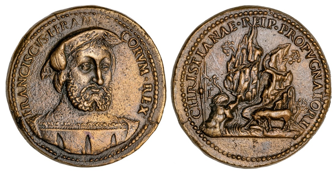 François I (1494-1547), King of France 1515. Medal, after 1535. Bronze, 39mm. FRANCISCVS.I.FRAN-CORVM.REX, Bust ¾ right in contemporary attire, rev. CHRISTIANAE.REIP.PROPVGNATORI, Unicorn left in a hilly landscape dipping its horn into a stream, spear, halberd and sword at left. Pollard (NGA 615) notes just two recorded specimens. Armand III, 242B; Kress 537. The National Gallery example appears to be the model for this piece. An Extremely Fine later cast.