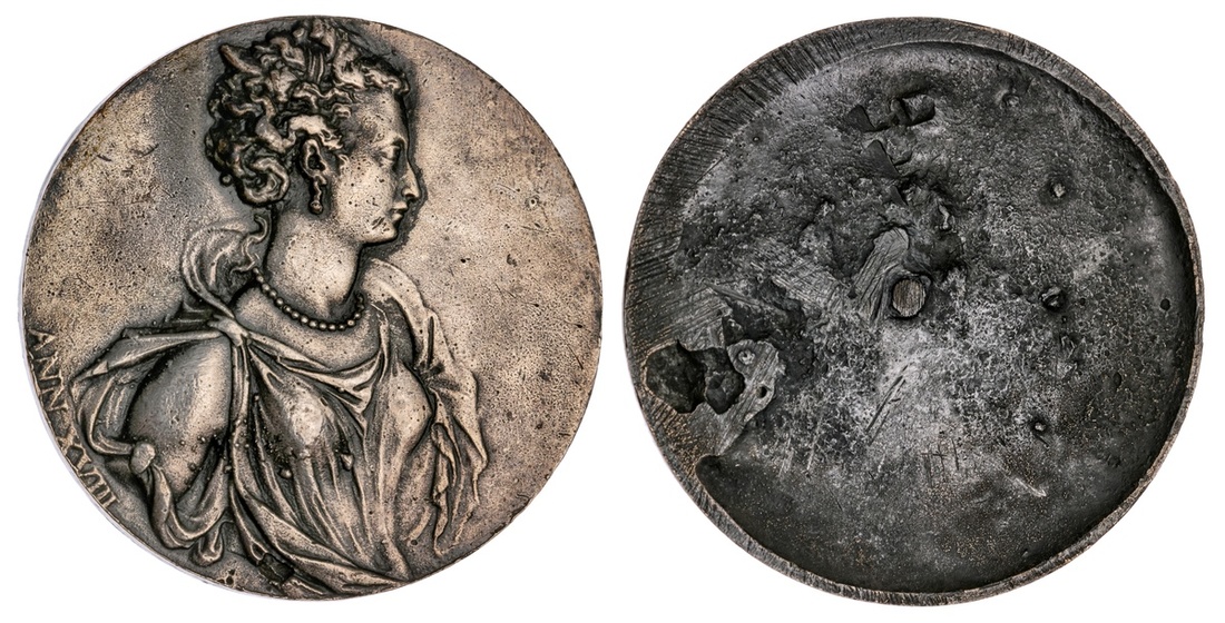 Portrait of an Unknown Woman. Round plaquette, ca. 1570. Silvered Copper Galvano, 61mm. Draped bust of a young, elegant woman right wearing a pearl-necklace, her arm bare, ANN.XVIII lower left. About Extremely Fine.