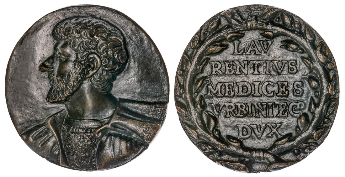 Lorenzo di Piero de' Medici (1492-1519), Duke of Urbino 1516 and Lord of Florence. Medal. Bronze, 81mm. High-relief, draped and embroidered-doublet bust in profile left sporting a beard, rev. LAV / RENTIVS / MEDICES / VRBINI Co/ DVX within a wreath. Toderi-Vannel 1422. Attwood suggests that the anepigraphic obverse sets this piece apart from all of da Sangallo's other medals and may therefore be his very first [Italian Medals, 790].