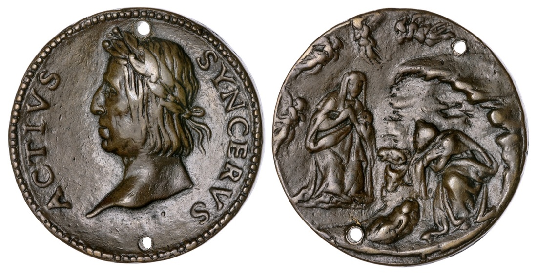 Jacopo Sannazaro (1458-1530). Medal, ca. 1520. Bronze, 35mm. ACTIVS SYNCERVS, Head left wearing laurel wreath, rev. Nativity scene alluding to his poem De partu Virginis. Hill Corpus 350.