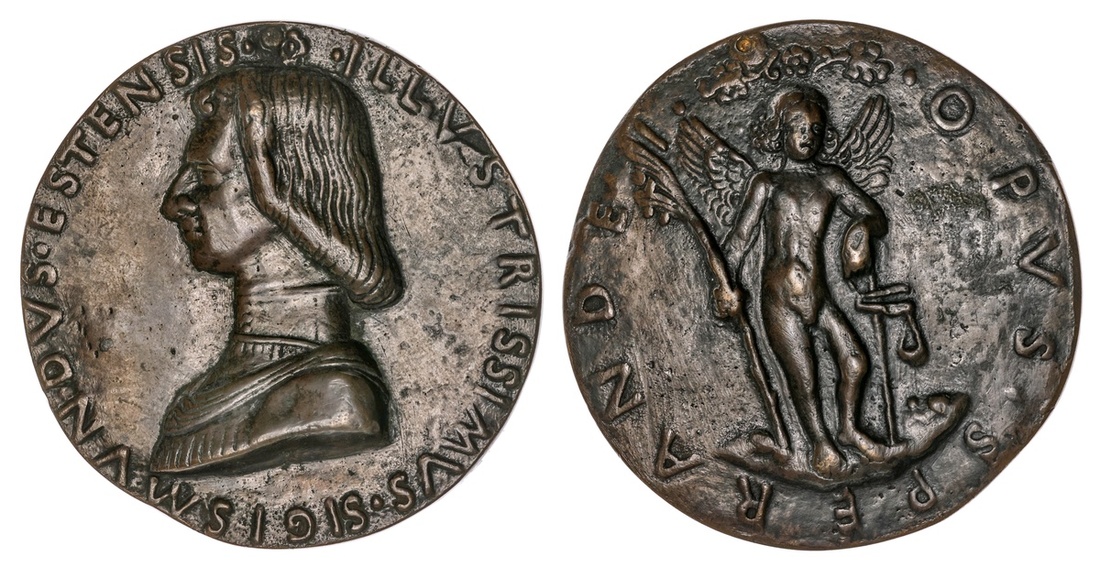 Sigismondo d'Este (1433-1507), Ferrarese Noble, Lord of San Martino in Rio, Campogalliano, Rodeglia, Castellarano, and San Cassiano, Governor of Reggio. Medal, ca. 1473. Bronze, 81.3mm. ILLVSTRISSIMVS.SIGISMVNDVS.ESTENSIS, Bust left wearing embroidered tunic and chain, rev. Amor standing facing slightly right, holding palm frond and balance and leaning his elbow on a sword, signed around: OPVS SPERANDEI. Hill 367. Cast after a pierced specimen. A Very Fine old cast. Ex Eugene V and Clare E Thaw, Millea Bros, Sale 81, Day 3 of 3, November 15-17, 2018, lot 3261 [part].