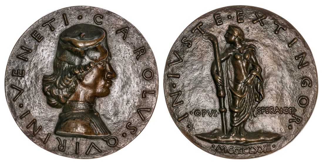 Carlo Quirini, Venetian Noble. Medal, dated 1472. Bronze, 84mm. CAROLVS.QVIRINI.VENETI., Bust right wearing soft hat, rev. IN.IVSTE.EXTINGOR, Woman standing facing, head left, holding long torch, signed: .OPVS.SPERANDEI. across, .MCCCCLXXII. Hill 369. Armand I, 73, 37. An Extremely Fine, albeit later cast.