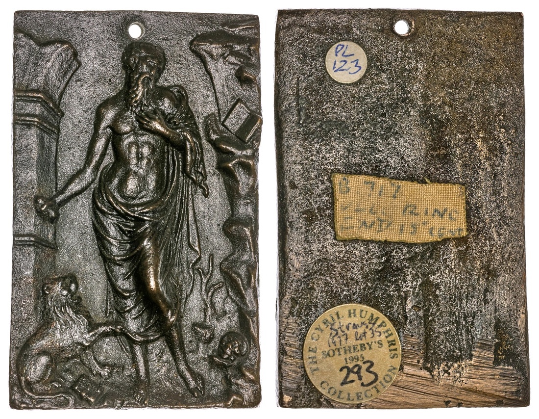 St. Jerome. Rectangular plaquette, Padua, early 16th Century. Pierced. Bronze, 48.5 x 76.3mm. Draped figure of St. Jerome, left hand on his chest, in his right hand he holds a stone, his lion and book in the foreground, skull and rocky cliff, and open book on its ledge, at the right; in the background, a broken arch. Unsigned version. Pope Hennessy NGA 236. Sotheby's and identification labels on back. An Extremely Fine old cast. Ex Cyril Humphris, Sotheby's (London), January 11, 1995, lot 293; Ex Robert Strauss, Christie's (London), May 3, 1977, lot 35.