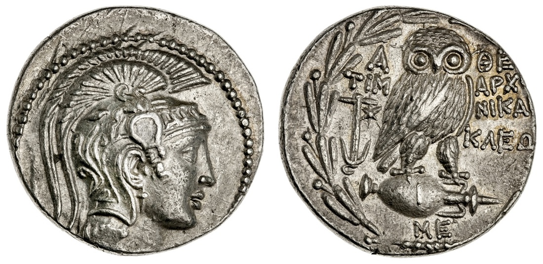 Athens. AR "New Style" Tetradrachm, struck 133/2 BC. Magistrates: Timarchos, Nikago-, Kleon. 16.84 gms. Helmeted head of Athena right, rev. Owl standing facing on amphora, anchor and star to left, I on amphora, ME below, magistrates names across. Thompson 368a, SNG Lockett 1937. Extremely Fine.