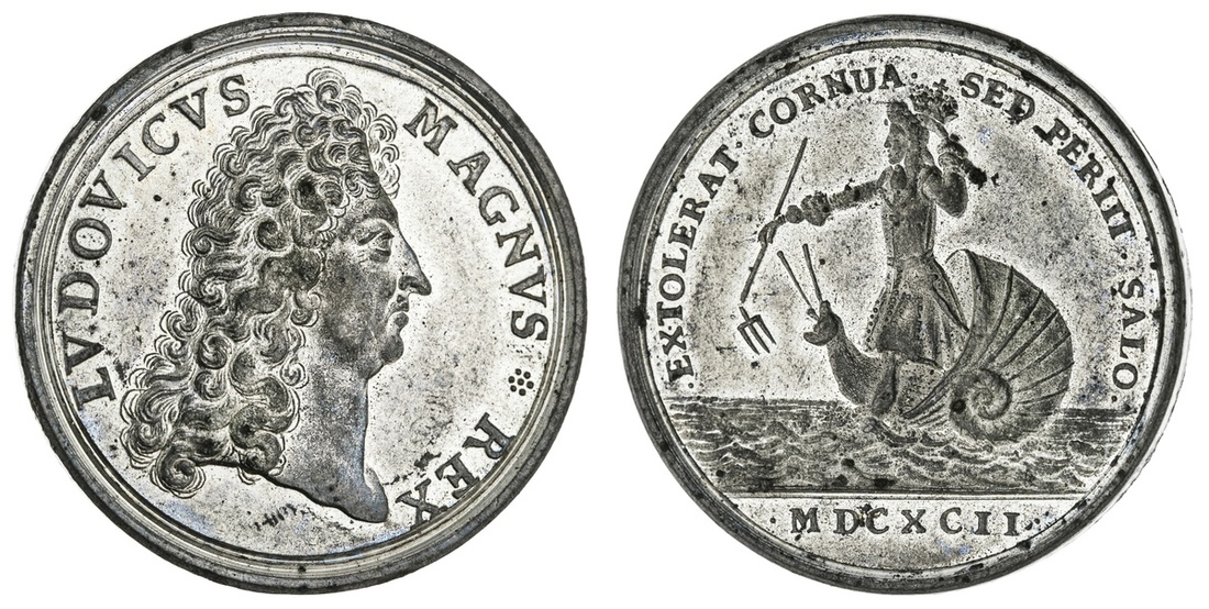 England. William and Mary (1688-1694). Battle of La Hogue, 1692. Dutch Medal. White Metal. Unsigned. Louis XIV head right, rev. Louis XVI, holding a broken trident, his crown falling from his head, standing left upon a snail in the sea; EXTOLERAT. CORNUA. SED.PERIT. SALO. ("He raised his horns but perished in the sea"). Of the reverse, Medallic Illustrations notes "When the snail is in full vigour, and not alarmed by danger, it boldly puts forth its horns; but when touched by salt water it perishes. The French fleet sailed with every appearance of strength and power, but at La Hogue it perished in the salt sea". British Naval Medals - Mountbatten 106; MI ii 66/270 (silver); V. Loon IV, 106,25 (silver). Very rare. Uncirculated.