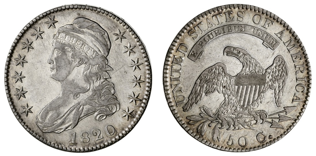 1820 Capped Bust Half Dollar. Square base 2, star on edge after "DOLLAR". O-108. Extremely Fine. Small hairline behind bust. Toned.