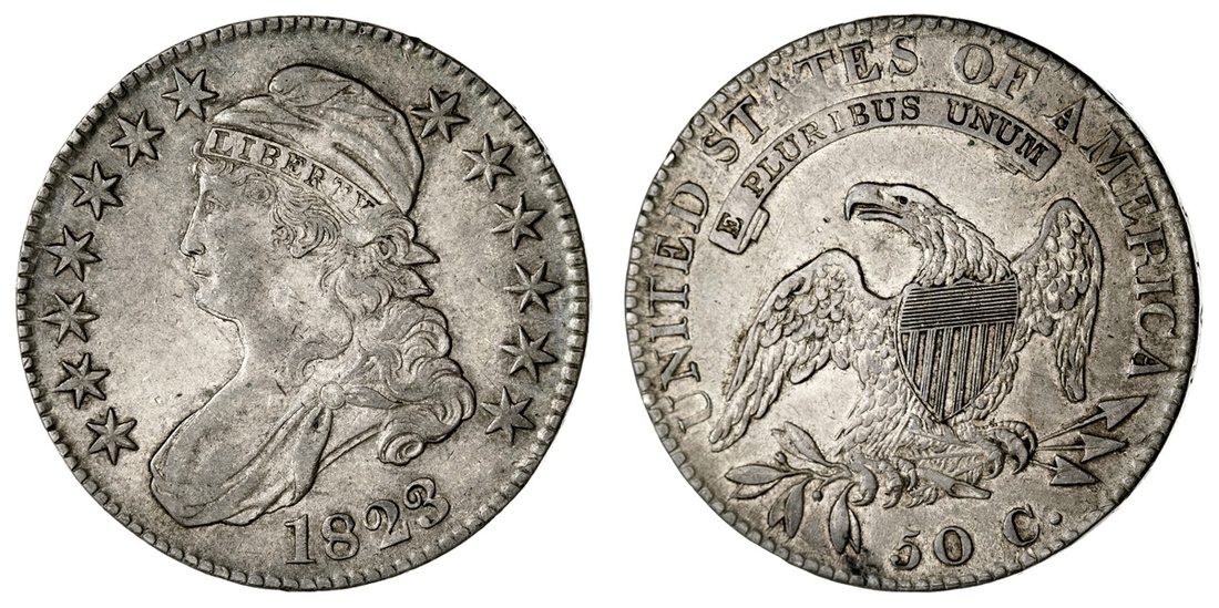 1823 Capped Bust Half Dollar. Doubled profile. Extremely Fine. Pearly medium gray tone.