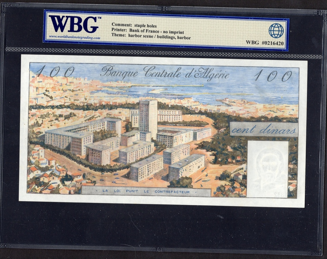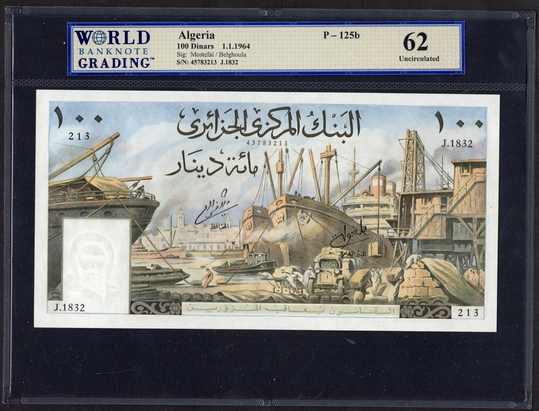 Algeria. Banque Centrale d'Algérie. 100 Dinars. 1964. P-125b. No. J.1832-293. Multicolor. Port of Algiers scene; Modern building complex on back. WBG Uncirculated 62, staple holes.