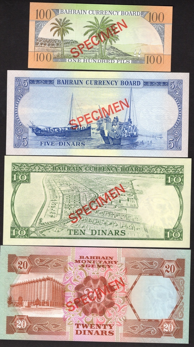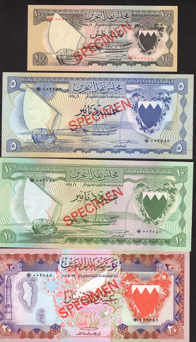 Bahrain. Bahrain Monetary Agency. Specimen 100 Fils, ¼, ½ Dinar, Specimen 1, 5, 10 and 20 Dinars. ND (1978). P-CS1. Collector Series. Uncirculated. [7]