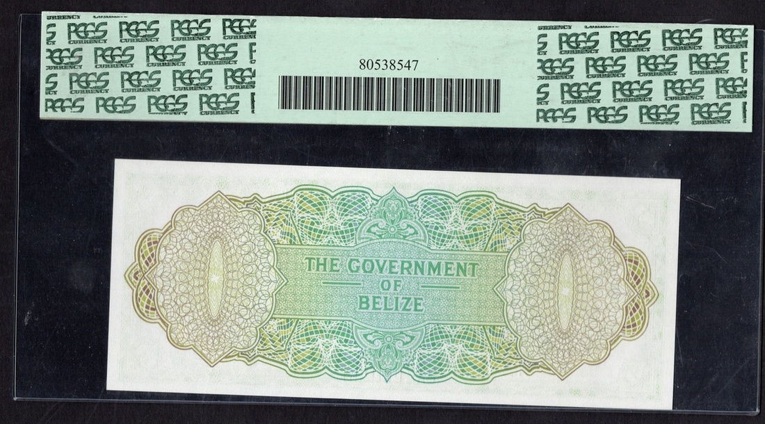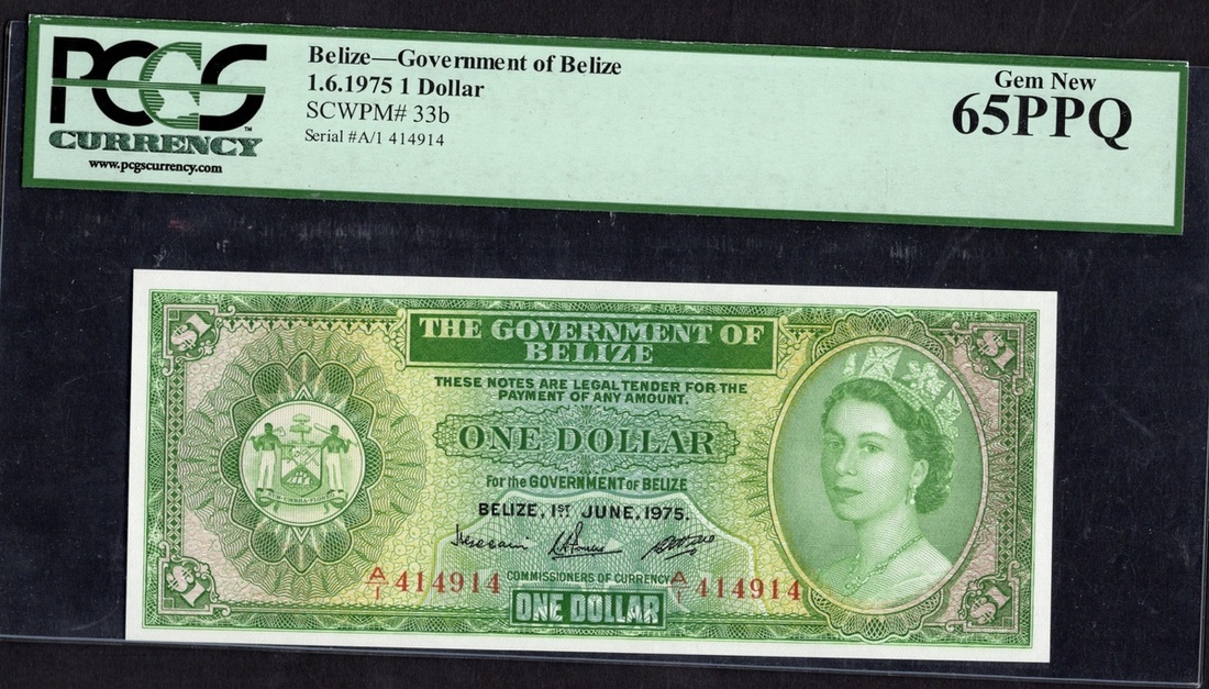 Belize. Government of Belize. 1 Dollar. 1 June 1975. P-33b. No. A/1 414914. Green on multicolor. Queen Elizabeth II portrait at right, Arms at left. PCGS Gem New 65 PPQ.
