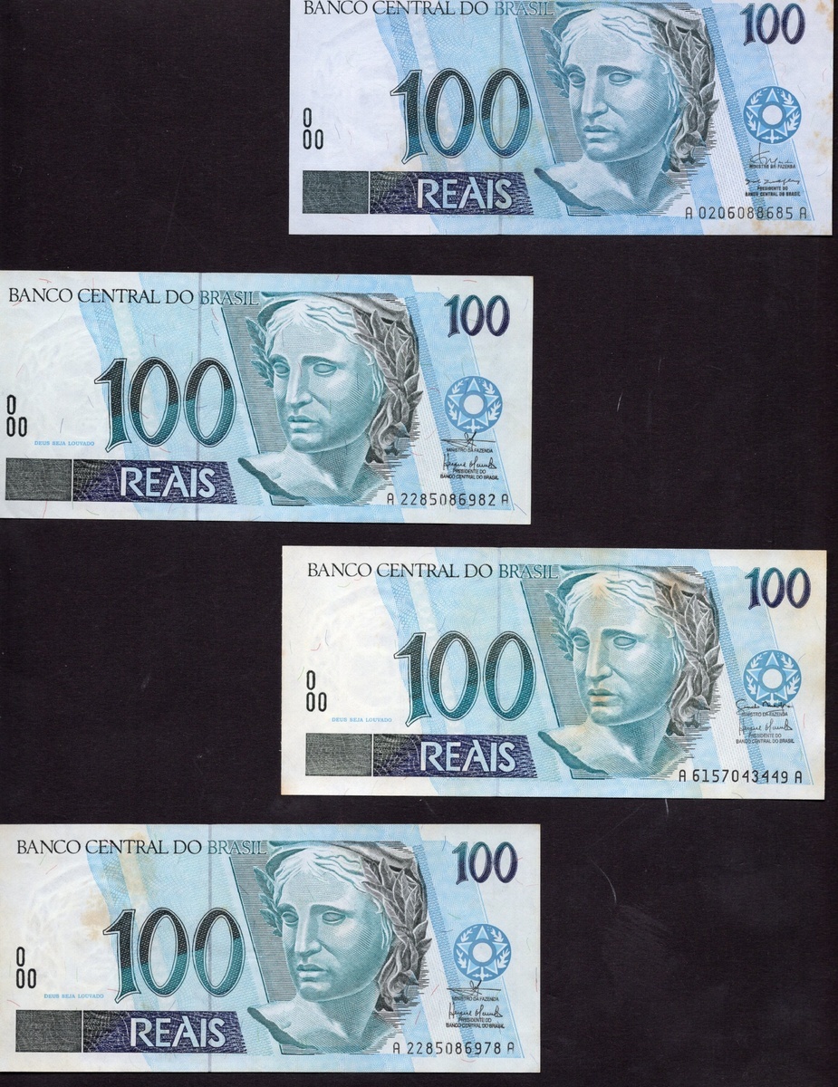 Brazil. July 1994 Monetary Reform. Quartet of 100 Reais. ND (1994-). P-247a. AU, stains; P-247e (2), f. AU-Uncirculated, two with stains. [4]