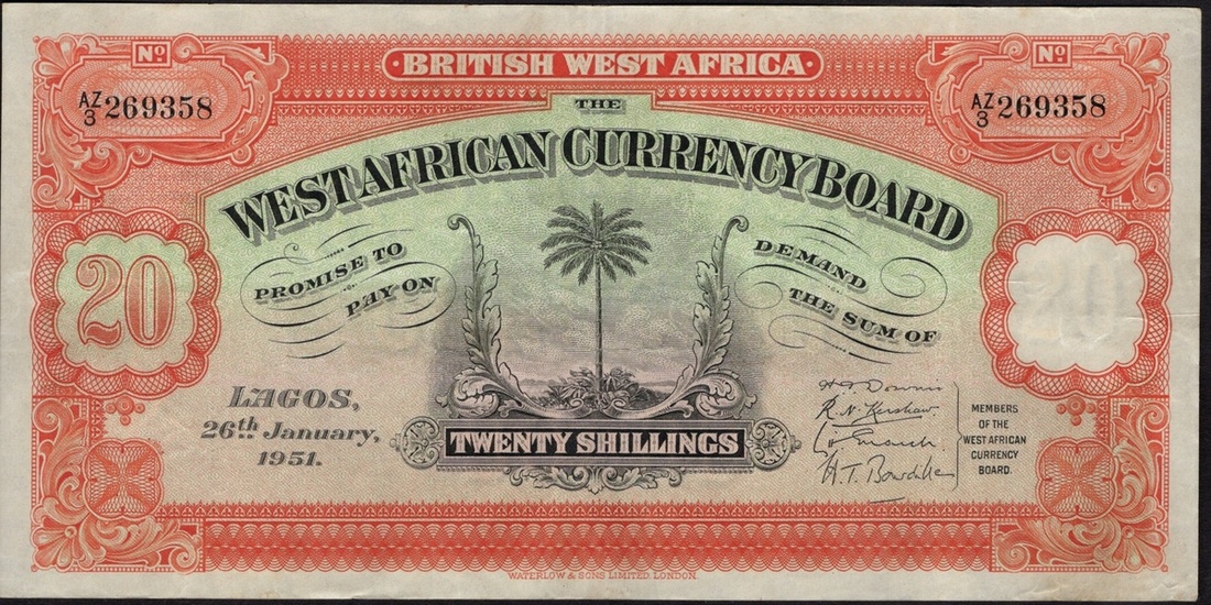 British West Africa. West African Currency Board. 20 Shillings. 26 January 1951. P-8b. No. A7/3 269358. Black and red on light green and pink. Palm tree at center; value in Arabic on back. Slight stain on back. Very Fine.