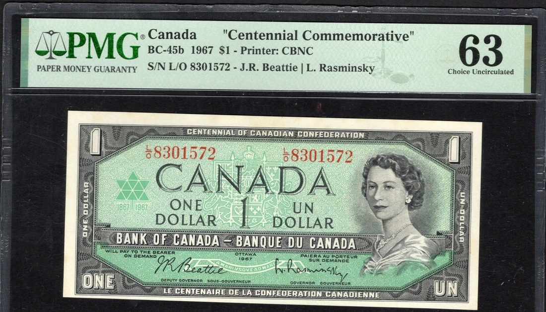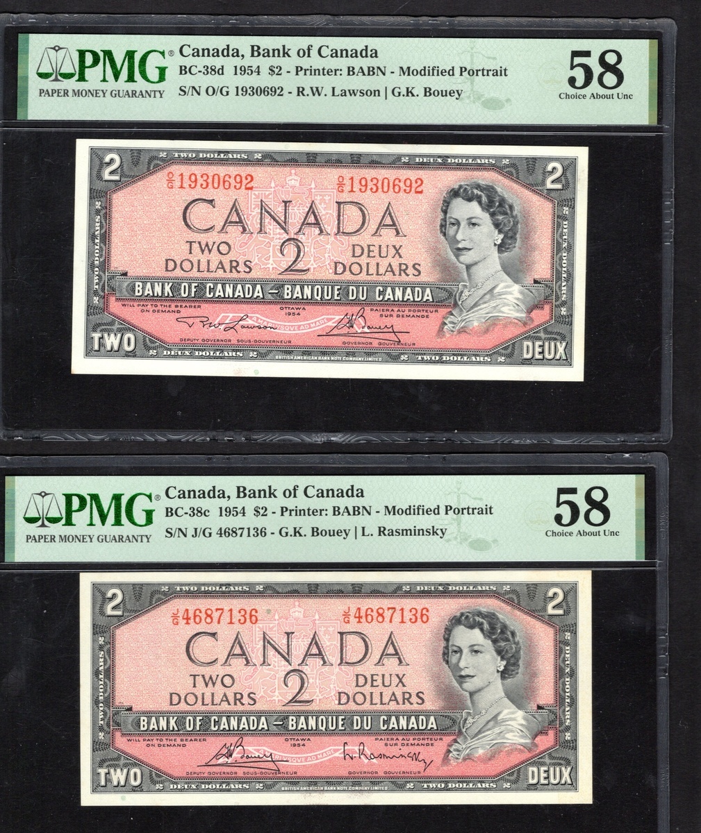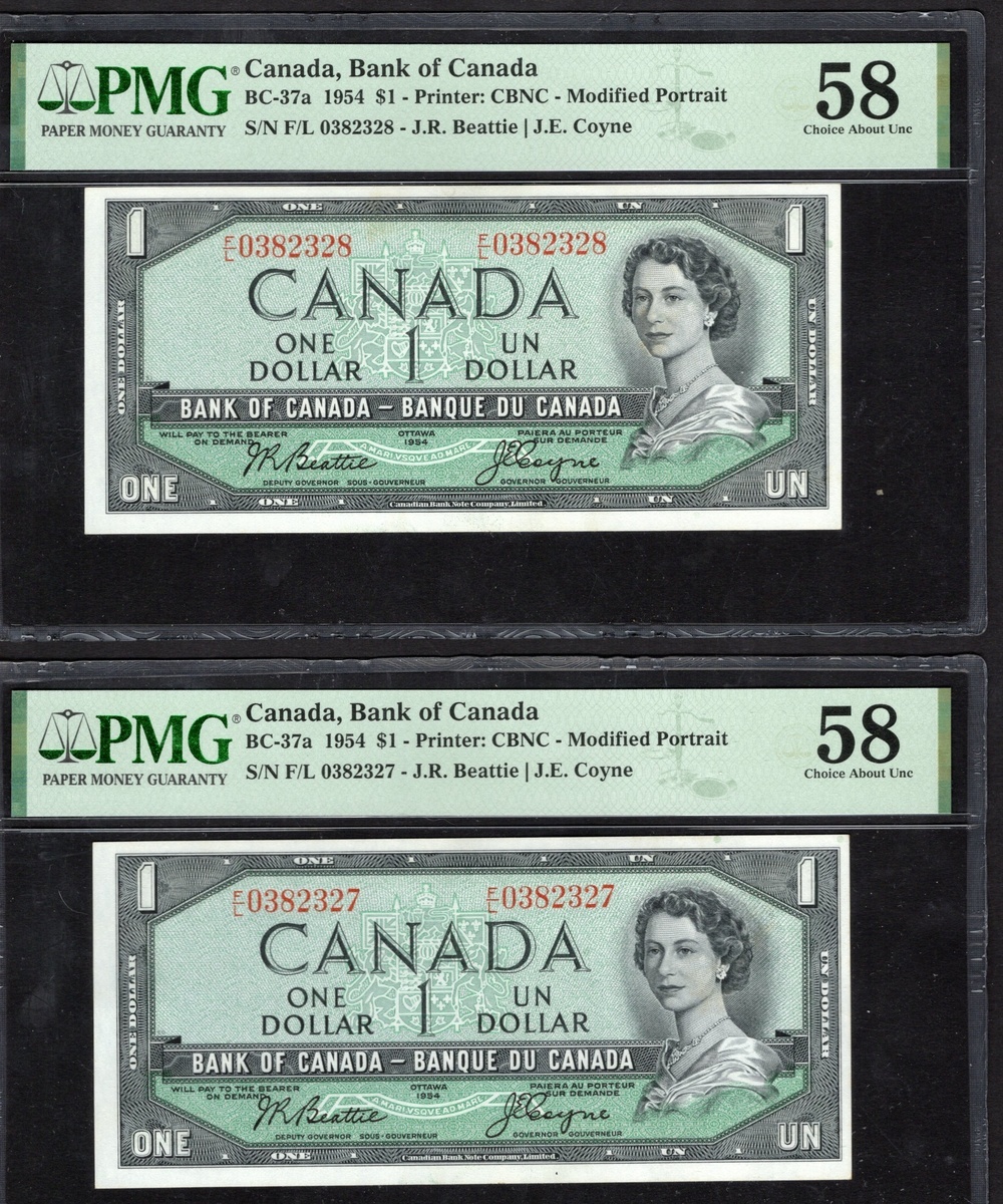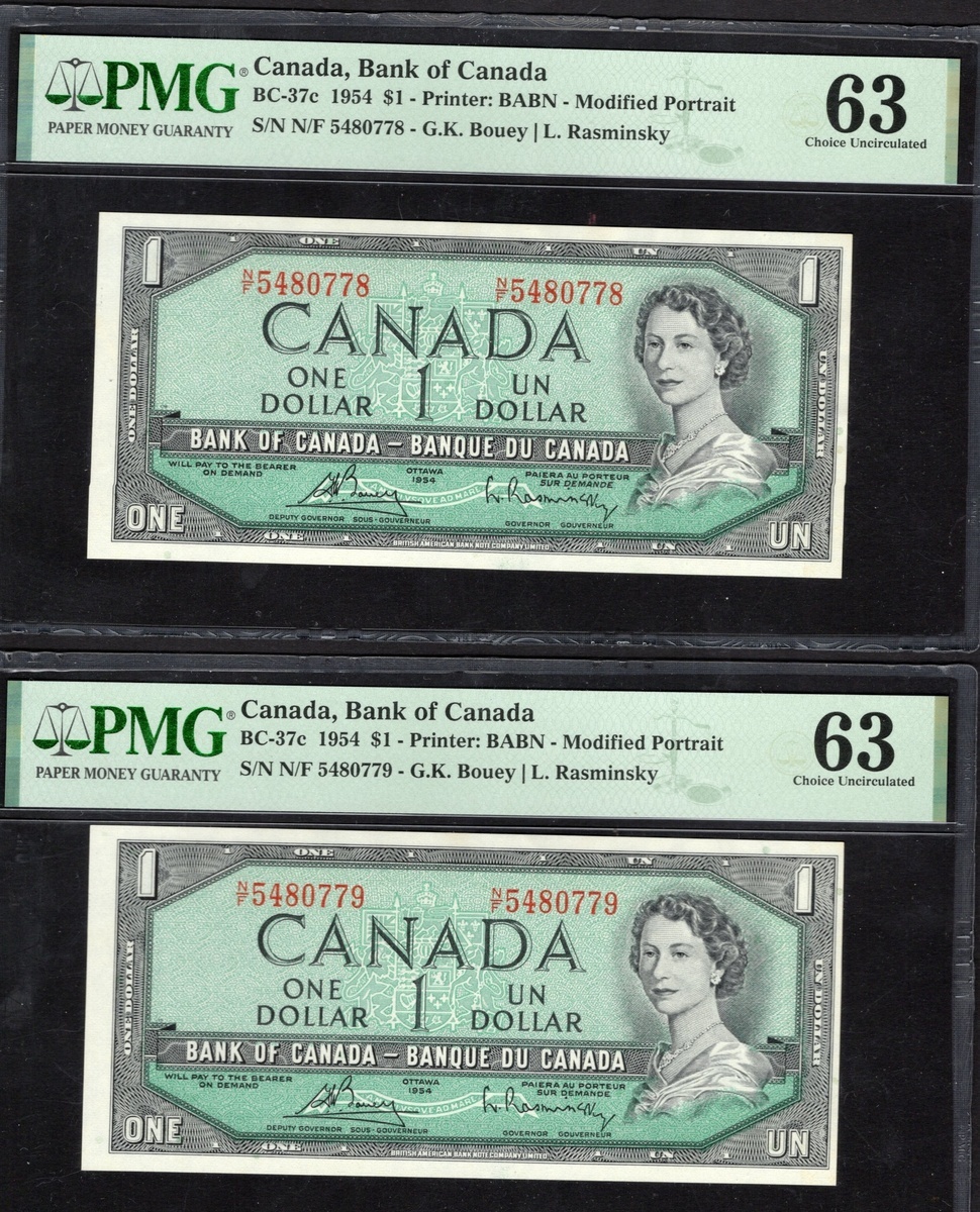 Canada. Bank of Canada. 1954 Series Lot. 1 Dollar. Signature: Beattie-Coyne (1955-61). P-75a, BC-37a (2). Consecutive. Both PMG Choice About Unc 58; Signature: Bouey-Rasminsky (1972-73). P-75c, BC-37c (2). Both PMG Choice Uncirculated 63; 1967 Commemorative issue (3). P-84b, BC-45b. Consecutive. All PMG Choice Uncirculated 63; 2 Dollars. Signature: Beattie-Rasminsky (1961-72). P-76b, BC-38b (2). Consecutive. Both PMC Choice Uncirculated 64; Signature: Bouey-Rasminsky (1972-73). P-76c, BC-38c (2). Consecutive. Both PMG Choice About Unc 58; Signature: Lawson-Bouey (1973-75). P-76d, BC-38d (2). Consecutive. Both PMG Choice About Unc 58; and 5 Dollars. Signature: Bouey-Rasminsky (1972). P-77c, BC-39c. PMG About Uncirculated 55. [14]